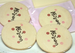 ありがとう」の文字をクッキーにプリントしました。白いクッキーと赤い模様がめでたいです。