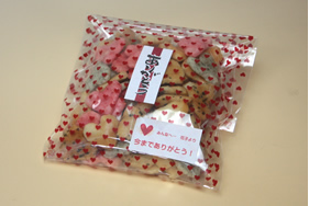 透明のビニールなのでパッと見で中の可愛らしい小粒のハートあられを認識してもらえます。