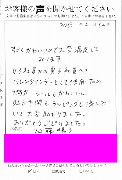 | すごくかわいいので大変満足しております。女子社員から男子社員へのバレンタインデーとして使用したのですが、シールもかわいいし、貼る手間もラッピングも住んでいて助かりました。ありがとうございました。