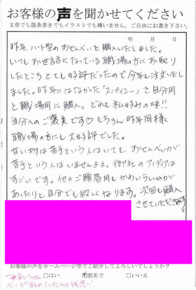 昨年、ハート形のおせんべいを購入いたしました。いつもお世話になっている職場の方にお配りしたところとても好評だったので、今年も注文いたしました。昨年にはなっかた「スパイシー」を自分用と職場用に購入。どれも私好みの味!!自分へのご褒美です。もちろん昨年同様職場の方にも大好評でした。