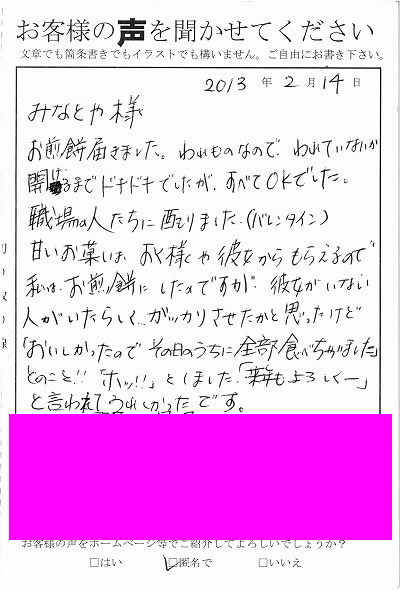 | みなとやでは、お客様の声を募集しています。お客様から頂いたお声・ご意見・ご感想は私達の財産です。ささいなことで構いません。今後のよりよりお店づくりとサービス向上のために、ぜひお客様の声をお届けください。