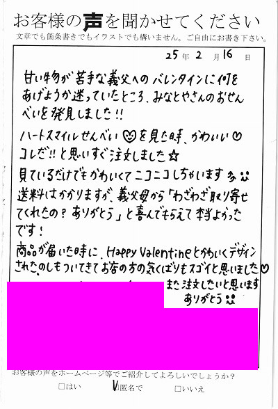 ●郵便でご応募の場合● 封書にて下記住所まで送っていただきますようお願いいたします。 〒135-0048 東京都江東区門前仲町2-4-9 有限会社みなとや お客様の声係 *頂いたお写真はお返しできませんので予めご了承くださいませ。