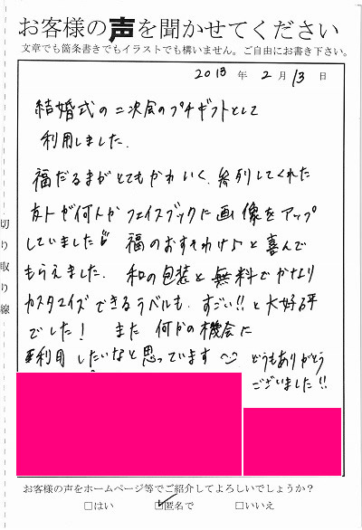 | 結婚式の二次会のプチギフトとして利用しました。福だるまがとてもかわいく、参列してくれた友人が何人かフェイスブックに画像をアップしていました。福のおすそ分けと喜んでもらえました。和の包装と無料でかなりカスタマイズできるラベルもすごい!!と大好評でした!また何かの機会に利用したいと思っています。どうもありがとうございました!!