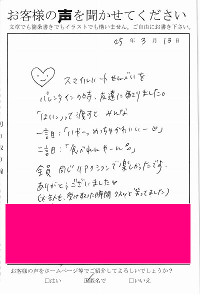 ほほえみ(笑)ハートせんべいをバレンタインの時、友達に配りました。