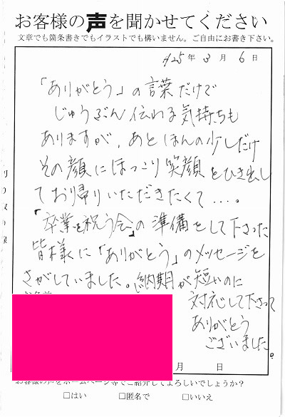 「卒業を祝う会」の準備をして下さった皆様に「ありがとう」のメッセージをさがしていました。納期が短いのに対応して下さってありがとうございました。