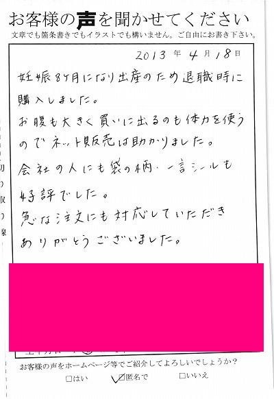 ご購入戴きました品物と一緒に写真をとって頂き、ご意見・ご感想をお寄せ頂けると幸いです 頂きましたご意見・お写真はサイト上に掲載させていただきます。ご了承下さいませ。 応募方法 ●ホームページでご応募の場合● こちらの フォームからお願いいたします。