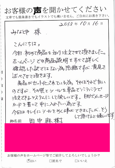 ご購入戴きました品物と一緒に写真をとって頂き、ご意見・ご感想をお寄せ頂けると幸いです 頂きましたご意見・お写真はサイト上に掲載させていただきます。ご了承下さいませ。 応募方法 ●ホームページでご応募の場合● こちらの フォームからお願いいたします。