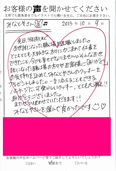 みなとやさん 先日、3年間ほどお世話になった職場を退職しました。とてもとても大好きな方々にかこまれて仕事をできたこと今でも幸せでなりません。そんなお世話になった職場の方々やお客様に「ありがとう」の気持ちを込めてみなとやさんのクッキーをプレゼントしました。一言添えることもできるパッケージに可愛らしいクッキー、とても大満足!!ありがとうございました。またぜひ使わせていただきます!! みなとやさんを選んで良かったです。