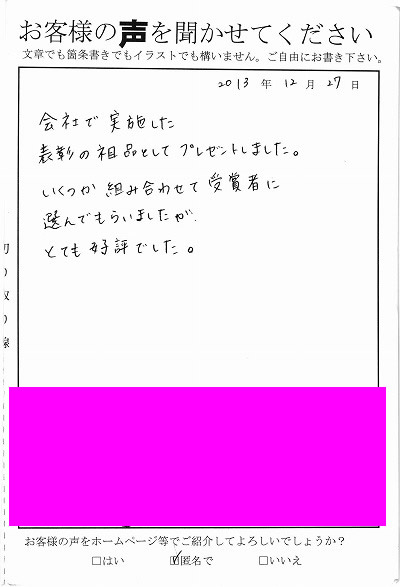ご購入戴きました品物と一緒に写真をとって頂き、ご意見・ご感想をお寄せ頂けると幸いです 頂きましたご意見・お写真はサイト上に掲載させていただきます。ご了承下さいませ。 応募方法 ●ホームページでご応募の場合● こちらの フォームからお願いいたします。