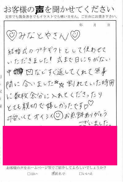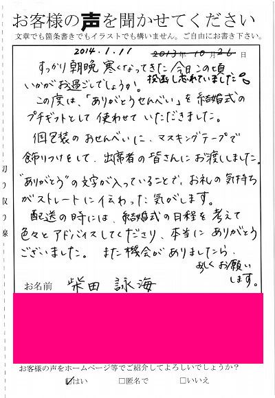 すっかり朝晩寒くなってきた今日この頃、いかがお過ごしでしょうか。 この度は「ありがとうせんべい」を結婚式のプチギフトとして使わさせていただきました。個別包装のおせんべいにマスキングテープで飾りつけをして出席者の皆さんにお渡ししました。”ありがとう”の文字が入っていることでお礼の気持ちがストレートに伝わった気がします。配送の時には結婚式の日程を考えて色々とアドバイスしてくださり本当にありがとうございました。また機会がありましたらよろしくお願いします。