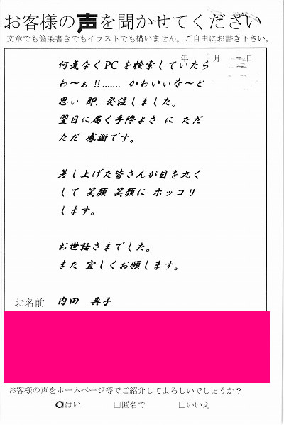 ご購入戴きました品物と一緒に写真をとって頂き、ご意見・ご感想をお寄せ頂けると幸いです 頂きましたご意見・お写真はサイト上に掲載させていただきます。ご了承下さいませ。 応募方法 ●ホームページでご応募の場合● こちらの フォームからお願いいたします。