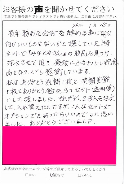 ●郵便でご応募の場合● 封書にて下記住所まで送っていただきますようお願いいたします。 〒135-0048 東京都江東区門前仲町2-4-9 有限会社みなとや お客様の声係 *頂いたお写真はお返しできませんので予めご了承くださいませ。