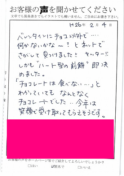 ご購入戴きました品物と一緒に写真をとって頂き、ご意見・ご感想をお寄せ頂けると幸いです 頂きましたご意見・お写真はサイト上に掲載させていただきます。ご了承下さいませ。 応募方法 ●ホームページでご応募の場合● こちらの フォームからお願いいたします。