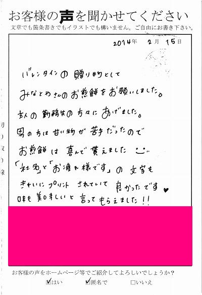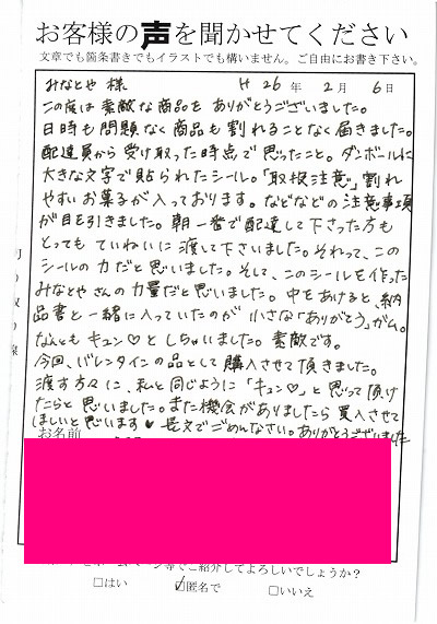 この度は素敵な商品をありがとうございました。日時も問題なく商品も割れることなく届きました。配達員から受け取った時点で思ったこと。ダンボールに大きな文字で貼られたシール。「取扱注意」割れやすいお菓子が入っておりますなどなどの注意事項が目を引きました朝一番で配達して下さった方もとってもていねいに渡してくださいました。それってこのシールの力だと思いました。そしてこのシールを作ったみなとやさんの力量だと思いました。中をあけると納品書と一緒に入っていたのが小さな「ありがとう」ガム。なんともキュンとしちゃいました。素適です。今回バレンタインの品として購入させていただきました。渡す方々に私と同じように「キュン」と思って頂けたらと思いました。長文でごめんなさい。ありがとうございました。