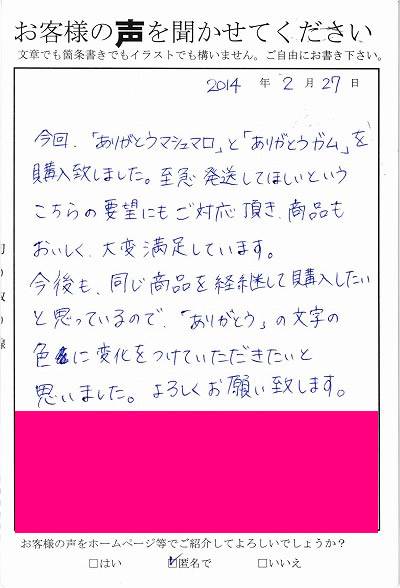 「ありがとう」の文字をチョコを包んだマシュマロにプリントしました。白地のマシュマロと赤い模様がめでたいです。子供達に人気のお菓子です。