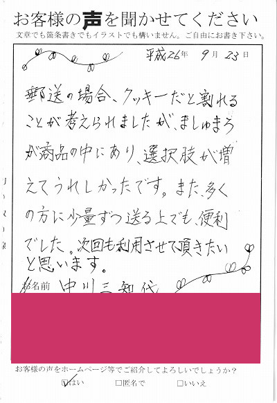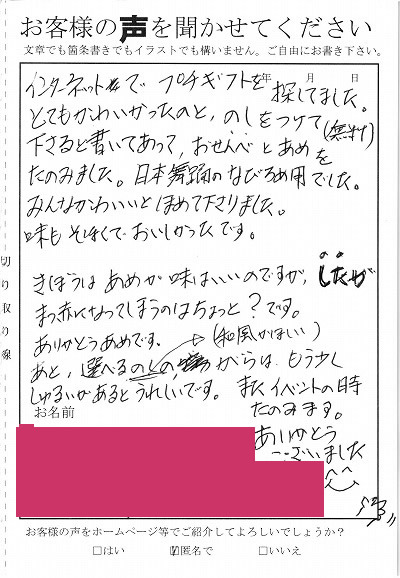 ご購入戴きました品物と一緒に写真をとって頂き、ご意見・ご感想をお寄せ頂けると幸いです 頂きましたご意見・お写真はサイト上に掲載させていただきます。ご了承下さいませ。 応募方法 ●ホームページでご応募の場合● こちらの フォームからお願いいたします。
