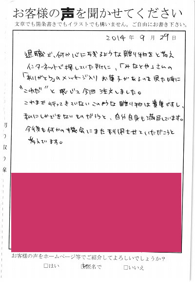 4年間勤めた会社の退職のご挨拶として購入させて頂きました。とてもお世話になった会社でしたので感謝の気持ちを伝えたいと思っていましたがお陰様でとても喜んでもらえました。また利用させて頂きます!有り難うございました!