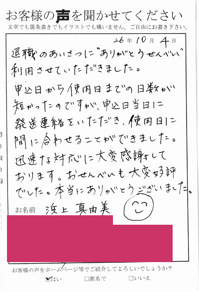 退職のあいさつに”ありがとうせんべい”利用させていただきました。