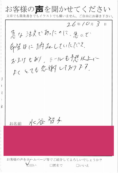急な注文であったのに、急いで希望日に納品していただき、おまけもあり、シールも想像以上によく、とても感謝しております。